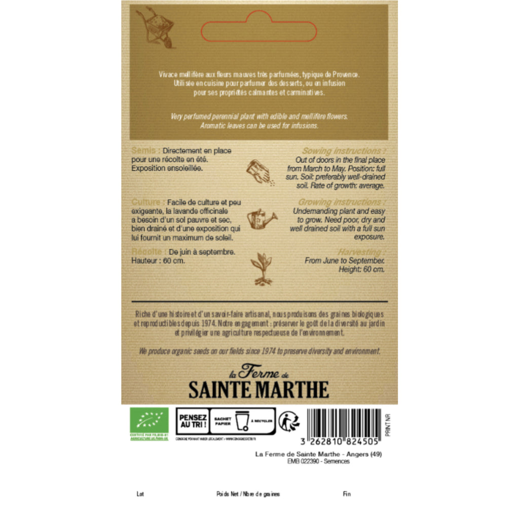 Semez de mars à mai dans un environnement chaud et humide. Les graines de lavande germent lentement : un trempage préalable de 24 h dans de l’eau tiède est recommandé. Repiquez les plants lorsqu’ils atteignent environ 10 cm de hauteur, en espaçant de 50 cm.