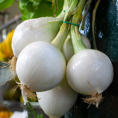 Oignon blanc de calibre moyen. Idéal pour les récoltes de petits oignons primeurs.