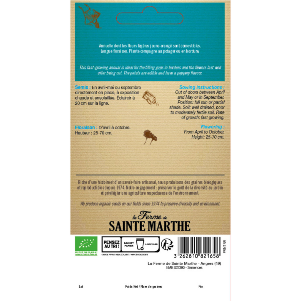 Cette plante annuelle fournit des fleurs légères, jaune-orangé et comestibles. A tester pour colorer vos salades !