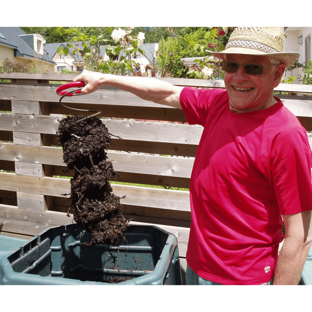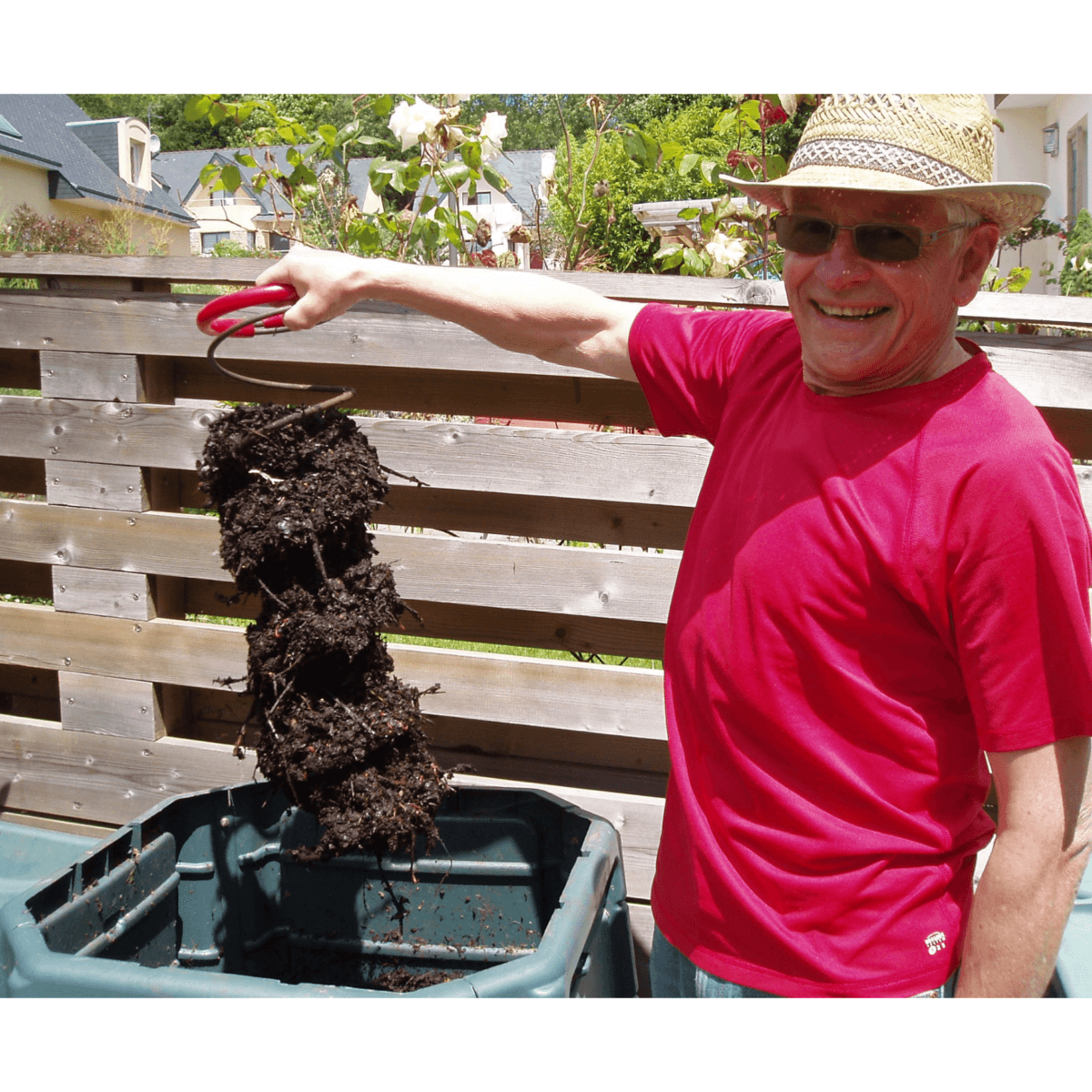 Le Brass'compost est un outil simple et indispensable pour s'assurer du bon déroulement du compostage, ce ressort de brassage permet d'aérer facilement et sans efforts le tas de compost ce qui réduit la durée de compostage.