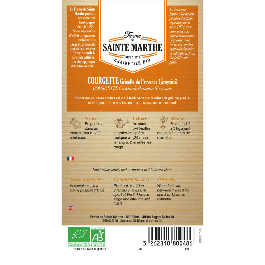 La Courgette Greyzini Grisette de Provence est une variété non coureuse, précoce et productive. Elle produit de 4 à 7 fruits par pied, à chair blanche, fine, tendre et d’excellente qualité gustative.