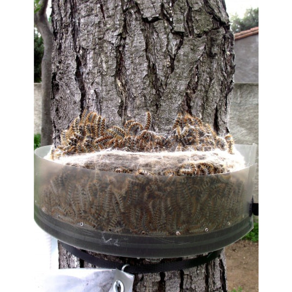 Avec ce piège fixé au tronc, les chenilles sont capturées dans le sac (à remplir de terreau ou de terre légère) avant d'atteindre le sol. Cette capture permet d'agir sans aucun contact avec le ravageur urticant tout en réduisant le risque de ré-infestation.