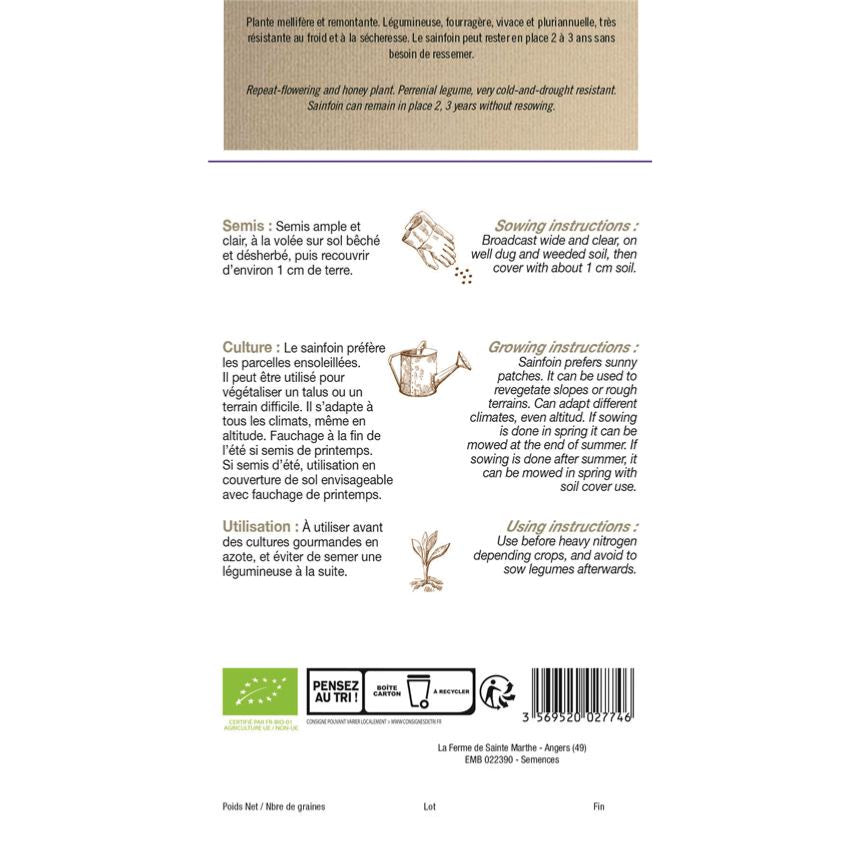 Le sainfoin est un engrais vert qui fait partie de la famille des légumineuses. Il convient très bien aux sols calcaires, chauds et secs et perméables.