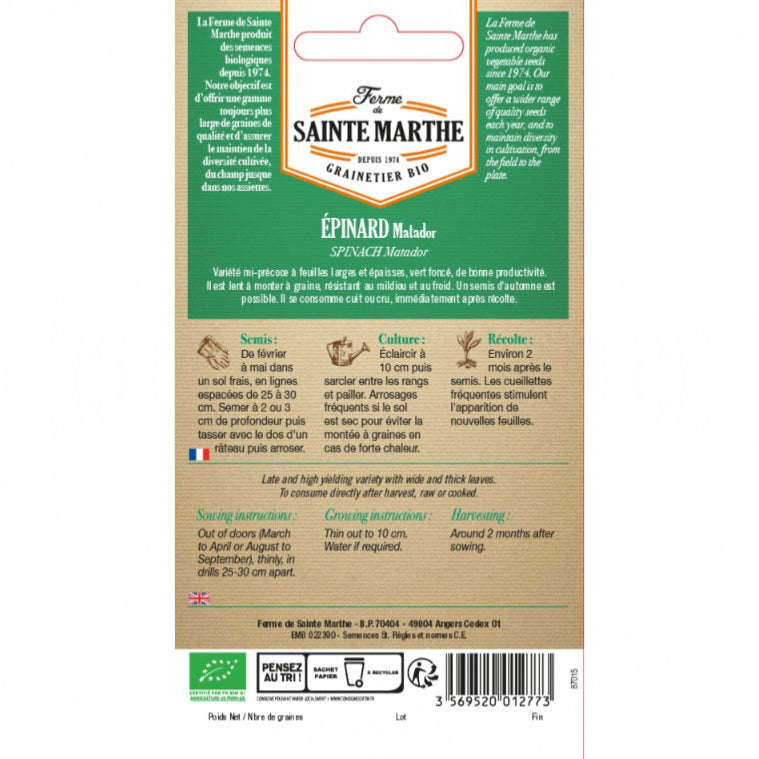 L’Épinard Matador est une variété mi-précoce produisant de larges feuilles épaisses d’un vert foncé profond. Lent à monter en graines, résistant au froid et au mildiou, il convient aussi bien aux semis de printemps qu’aux semis d’automne.