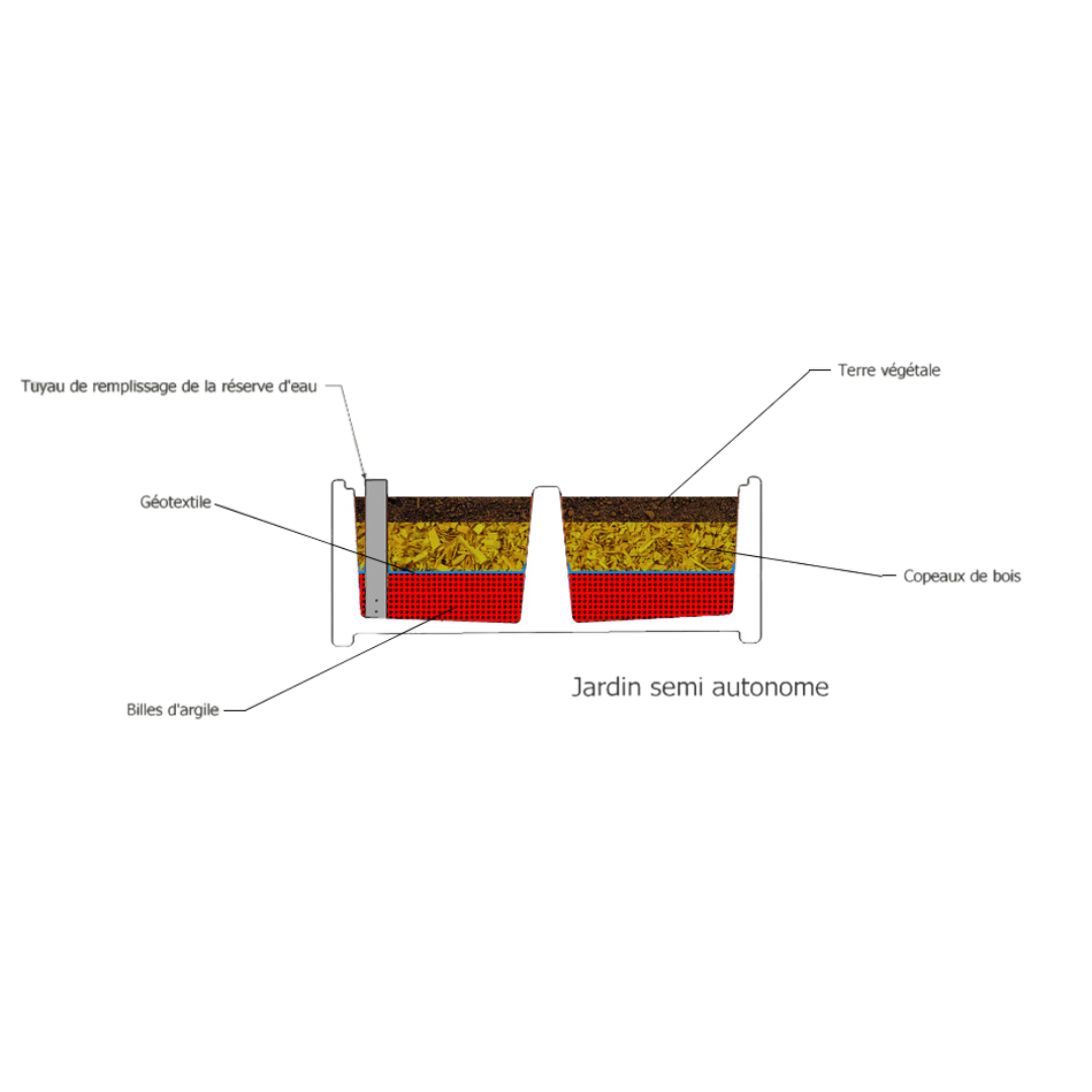 La réserve d’eau de 100 litres, située sous le bac de plantation, récupère en permanence les eaux de pluie ou d’arrosage, garantissant une autonomie de 2 à 3 semaines sans pluie.