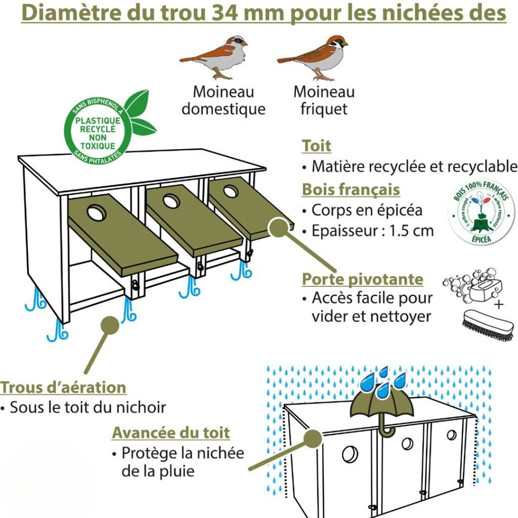 Les 3 trous d’ouverture de 34 mm sont parfaitement adaptés aux moineaux et autres petits oiseaux de jardin.