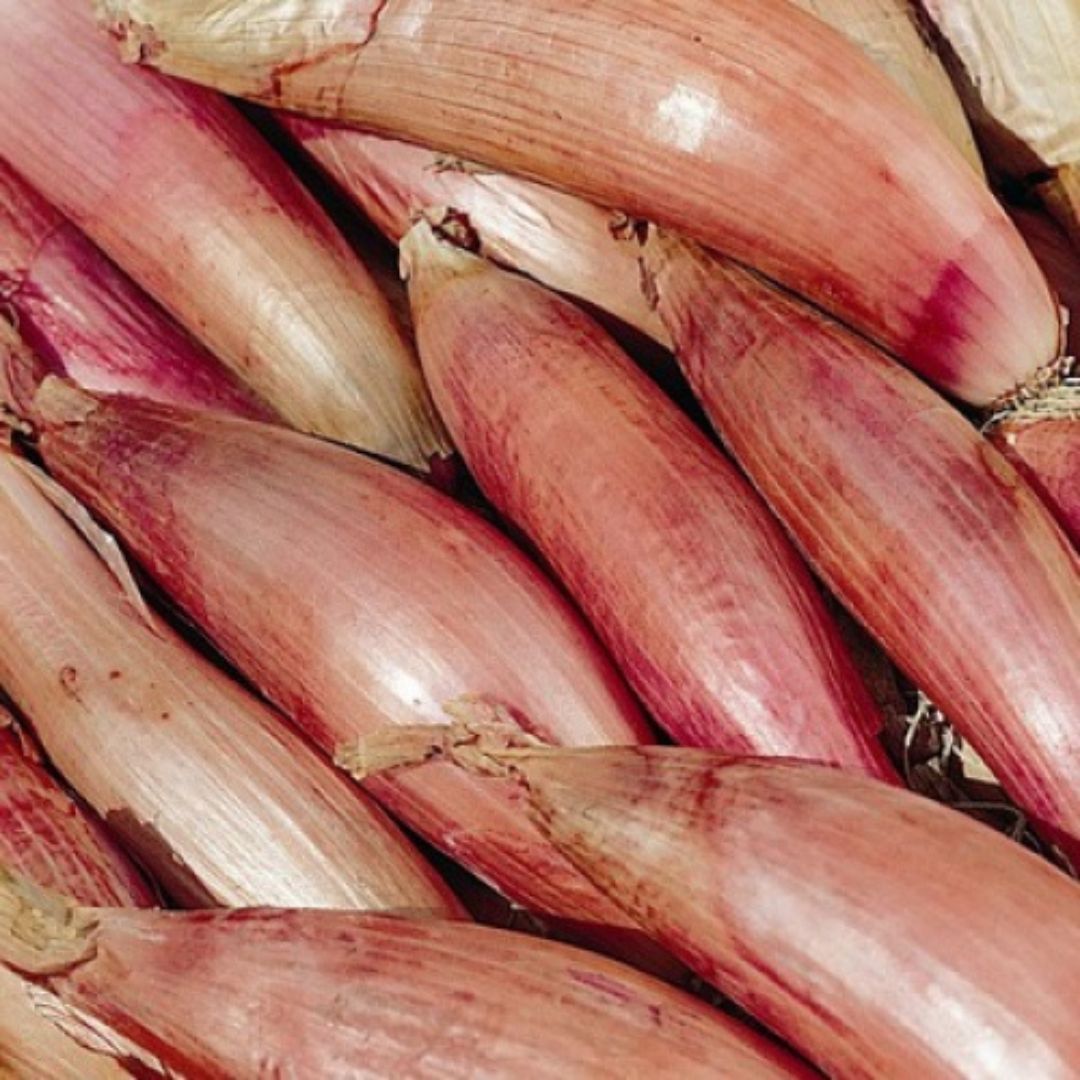 Variété rustique d'oignon rouge à la forme allongée et à la couleur rouge violacé.