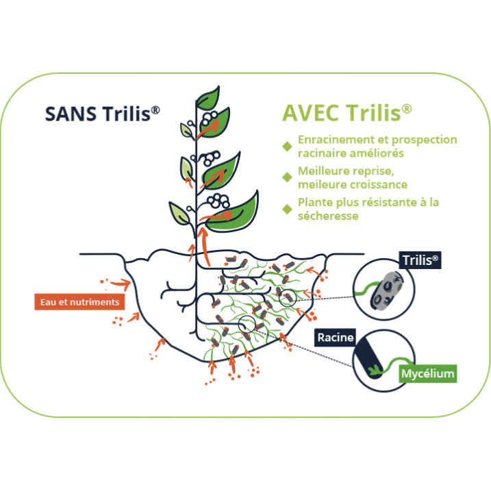 Les champignons mycorhiziens ont le pouvoir de chercher l’eau et les nutriments du sol (phosphore, zinc, manganèse...) dans des zones inaccessibles aux racines pour les remonter aux plantes.